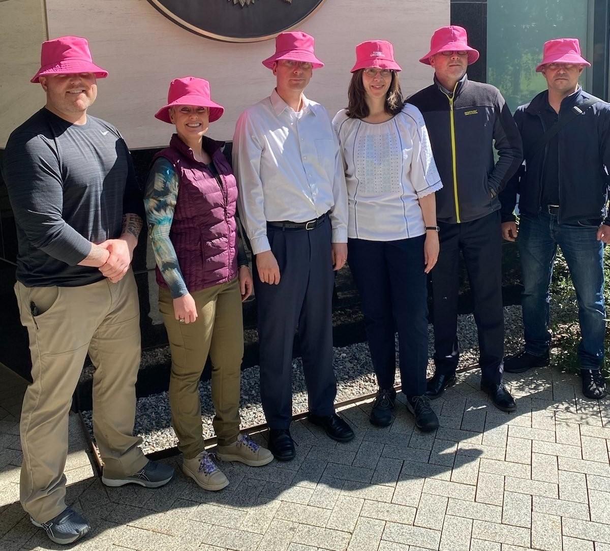 На фото – співробітники посольства у вишиванках та у рожевих панамах, таких, як у переможців “Євробачення-2022” Kalush Orchestra.