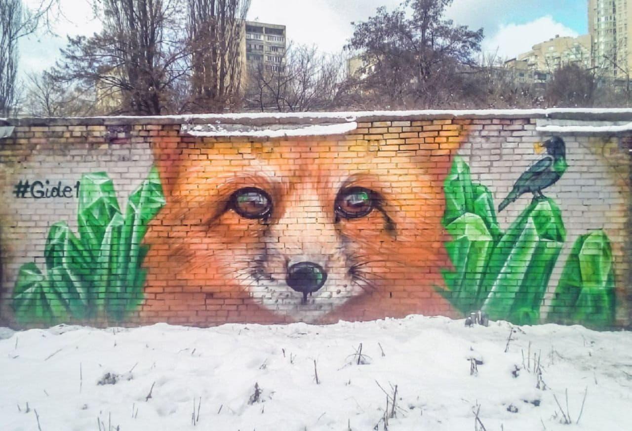 В Киеве в одном из детских садов недалеко от станции метро «Вокзальная» появился новый красочный мурал, на котором изображены лиса, ворон и изумруды.