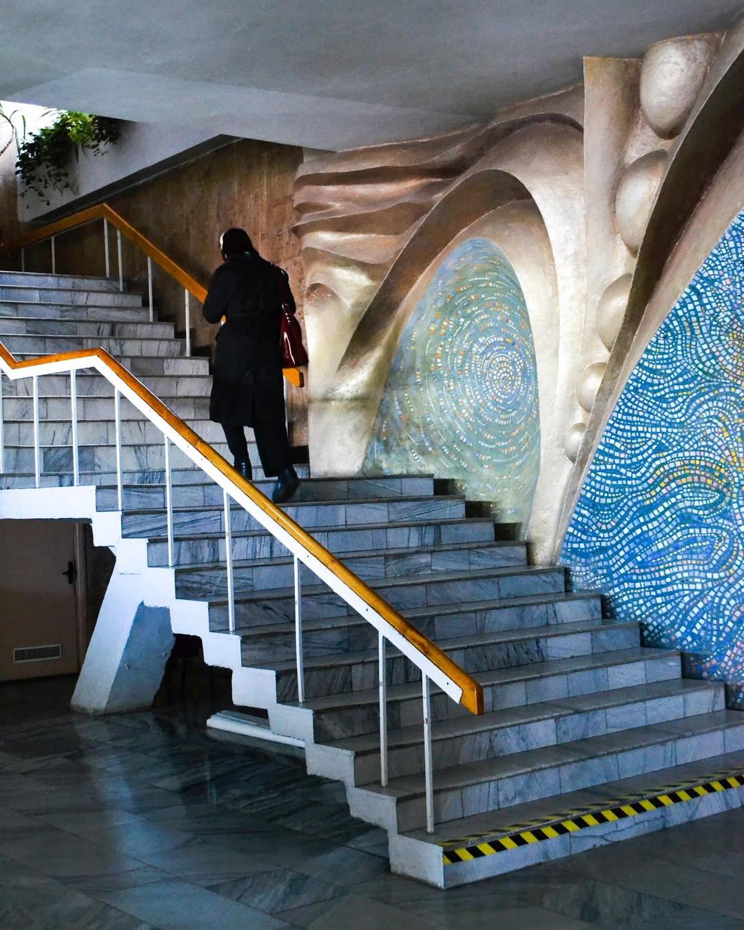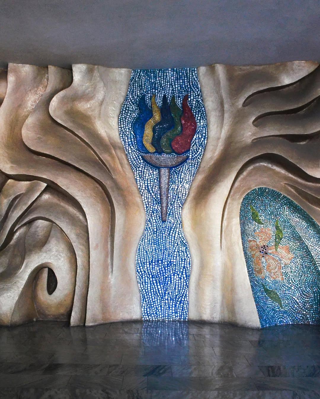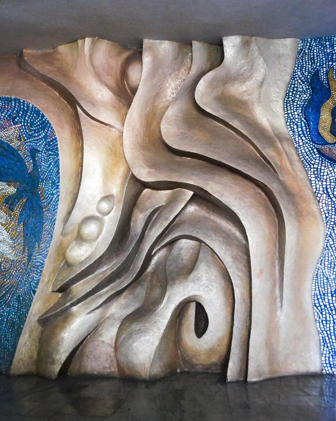 Рельєф із бетону і острівці з мозаїкою виглядають на стіні закладу гармонійно й вишукано.