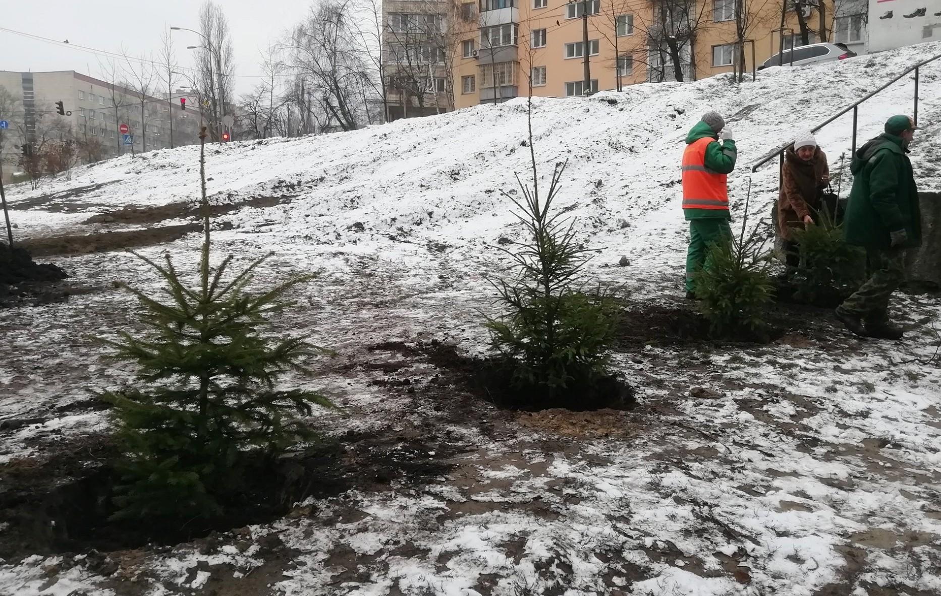 В Голосеевском районе столицы киевляне высадили в сквере Волонтеров (просп. Науки, 22) живые елки, которые в декабре по предварительной договоренности они покупали на Новый год.