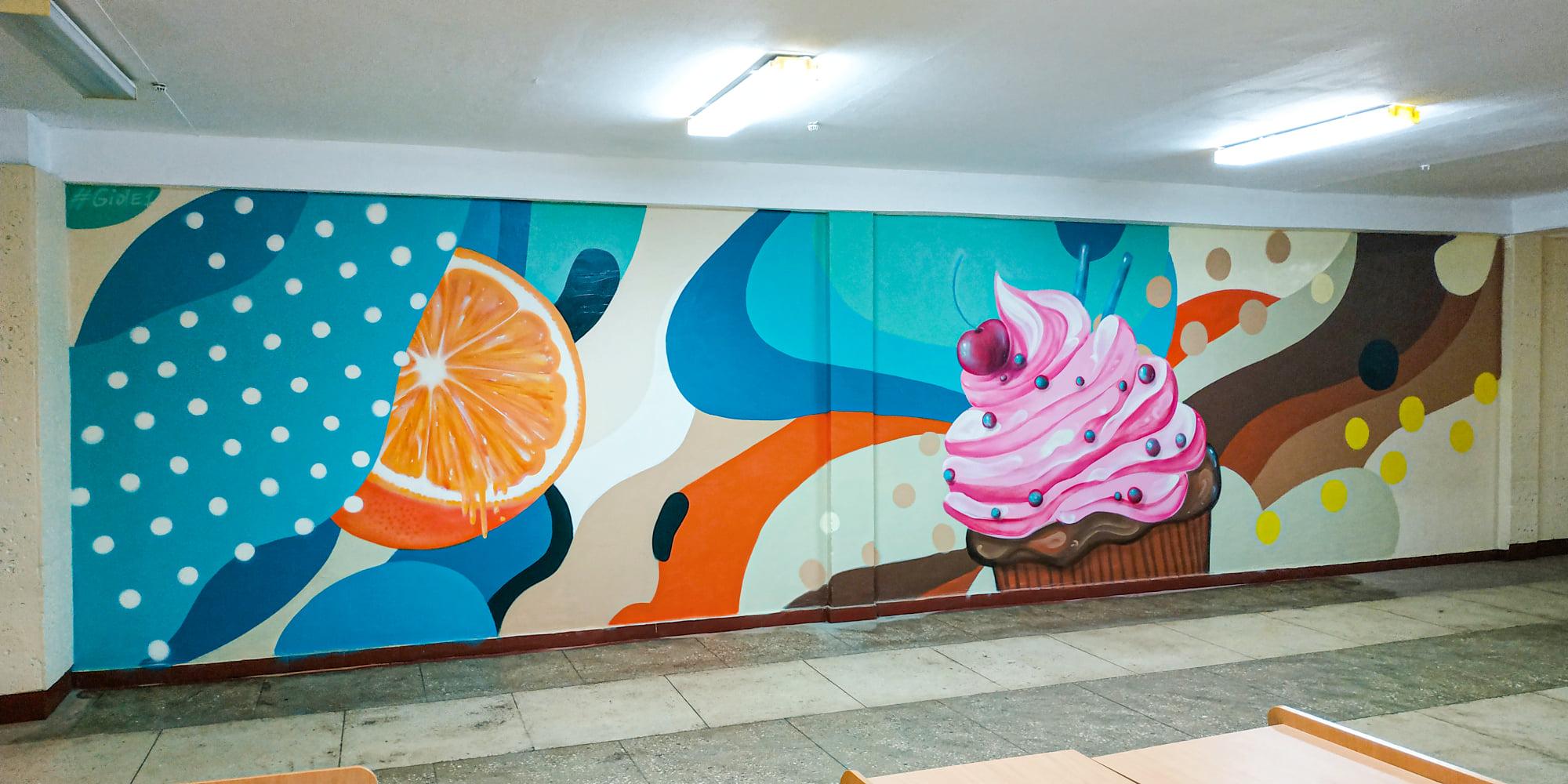 На столичной Троещине стены школьной столовой украсил яркий мурал, на котором изображен апельсин и кекс с кремом.
