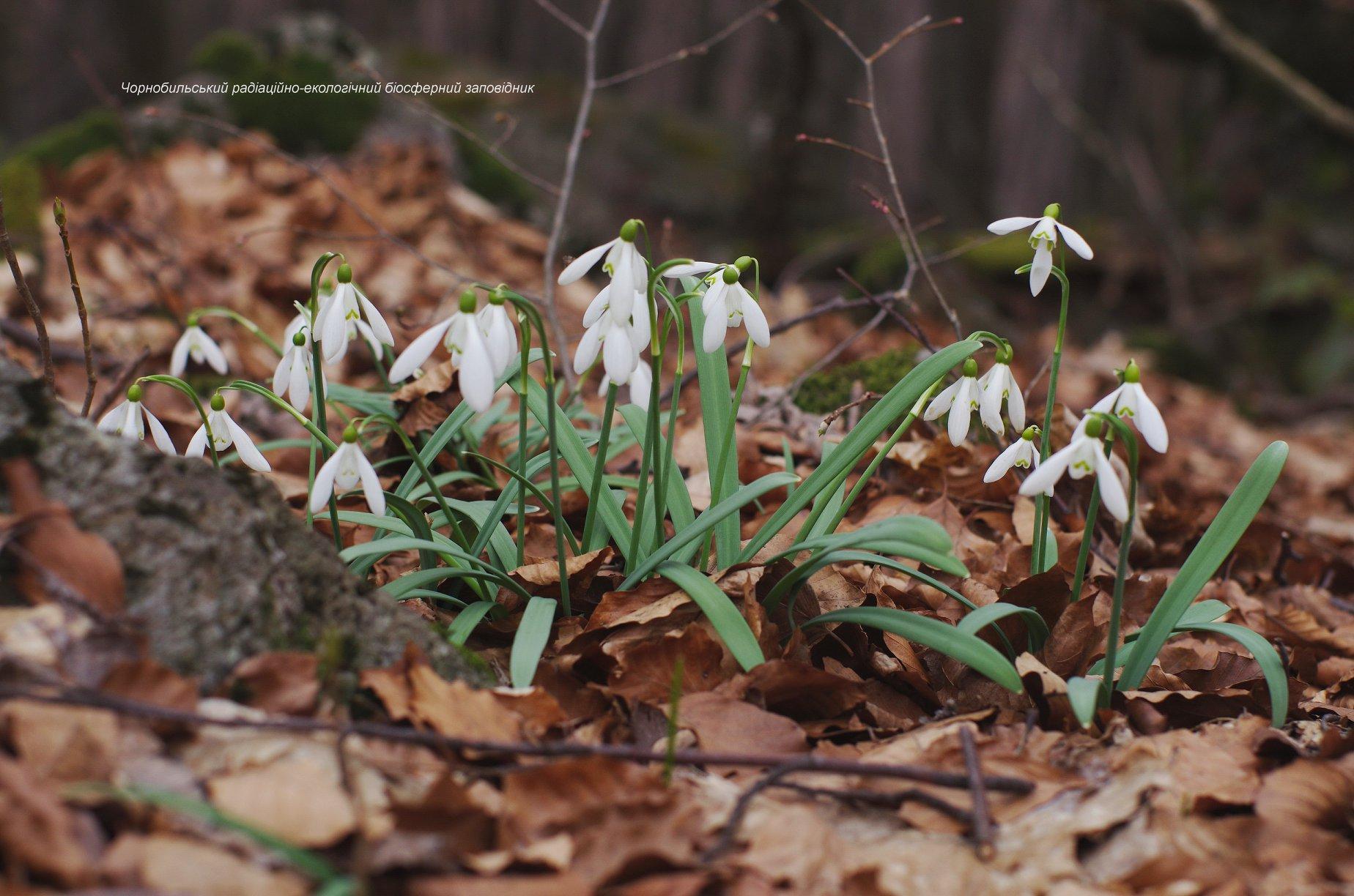 Подснежник белоснежный (Galanthus nivalis) – первый и самый нежный цветочек, перевод с латинского названия – “молочный цветок снежный”. Этот вид распространен в Украине в Карпатах, лесостепи и изредка на Полесье, но становится все более редким. Обычно он расцветает в середине марта, пробивая снег, не боится морозов. В этом году, из-за теплой зимы зацвел в Чернобыле в начале февраля.