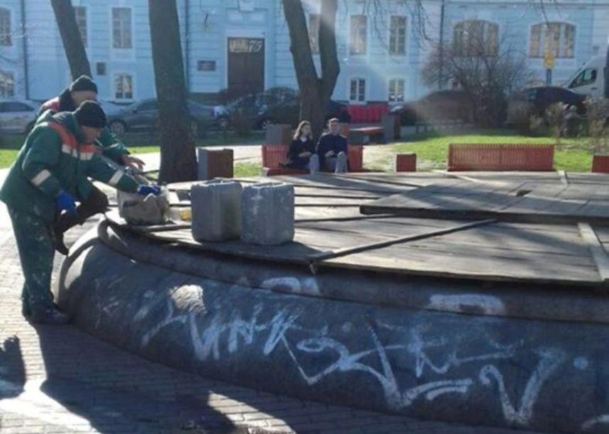 Сезон фонтанов еще даже не открыт, а вандалы уже орудуют вовсю. Так, на Контрактовой площади хулиганы обрисовали чашу фонтана автокраской, которую очень тяжело удалить.