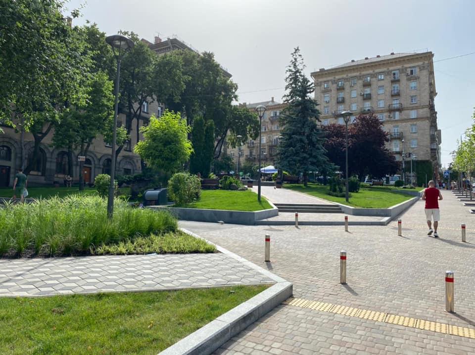 Ідеться про ділянку вул. Прорізної від вул. Пушкінської до Хрещатик. Саме тут можна побачити оновлені лави для перепочинку у затишному сквері, відремонтовану бруківку на проїжджій частині і оновлений тротуар з ФЕМів.