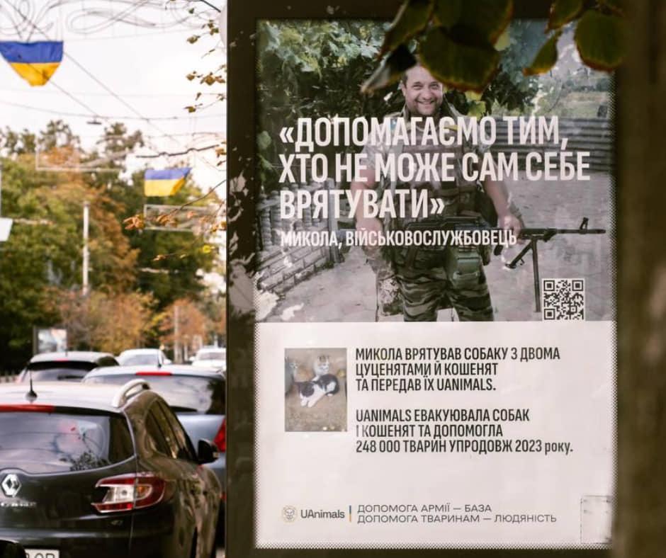 На вулицях Києва, Харкова та Одеси, а також на станціях метро зʼявилися борди та сітілайти. На них — історії військових та тварин, яких ті врятували від війни. І це не лише коти та собаки. Так, Олександр з Донеччини передав команді евакуації UAnimals корову.