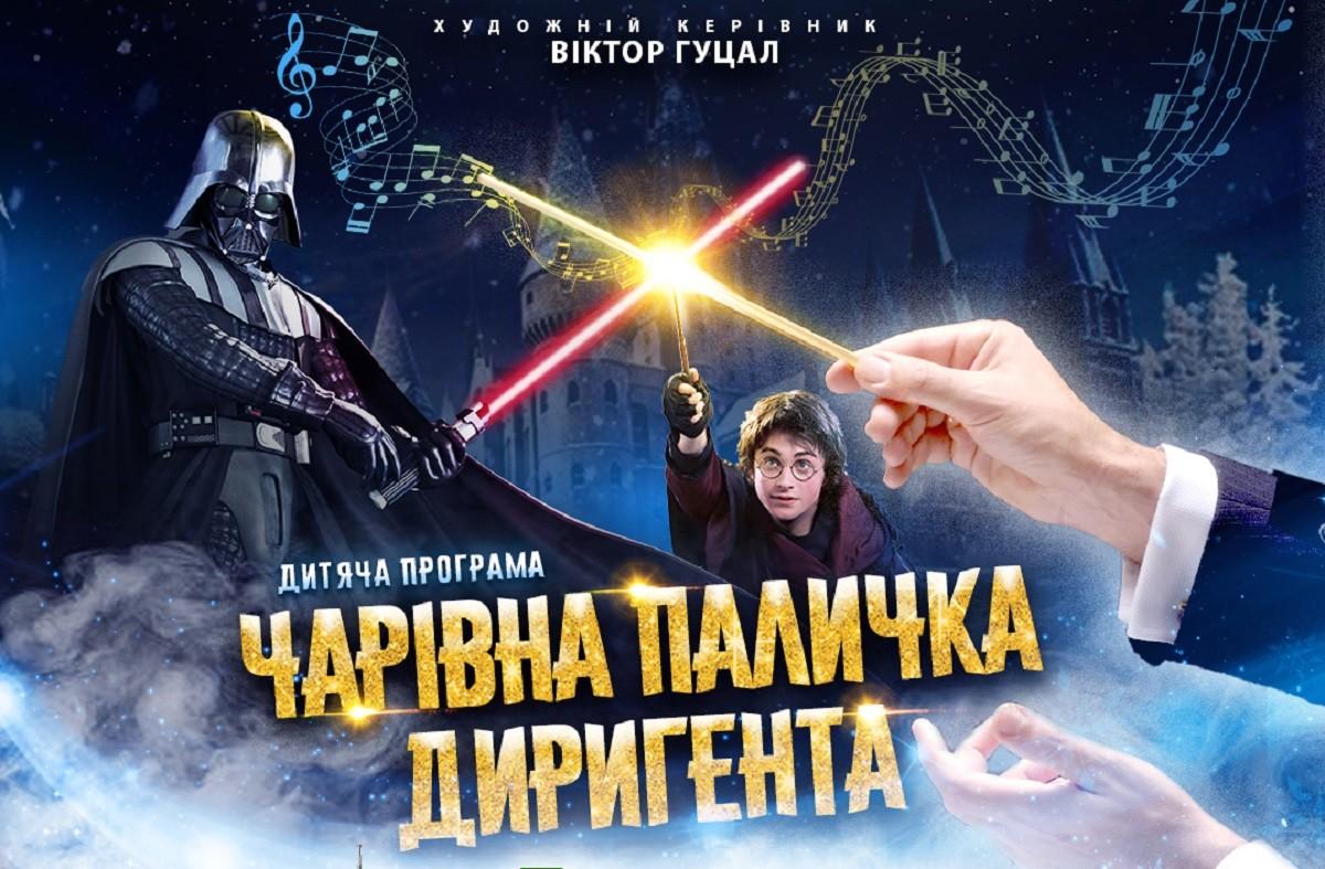 Диригент та музиканти оркестру у взаємодії з казковими персонажами Дарт Вейдером та Гаррі Поттером проведуть слухачів магічним музичним дійством, під час якого діти познайомляться із народними та класичними музичними інструментами, вивчать чи згадають українську абетку, послухають і подивляться фрагменти з улюблених кінофільмів “Гаррі Поттер” та “Зоряні війни”, а також, мультфільмів.