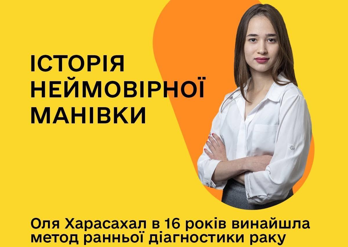 Оля Харасахал – 21-річна науковиця, яка ще школяркою винайшла метод ранньої діагностики раку шкіри. Вона вже встигла стати наймолодшою володаркою Всеукраїнської премії «TOP 30 UNDER 30» та отримати «Студентський Оскар» – премію «Studway Award 2019». Оля перемагала на наймасштабніших міжнародних наукових олімпіадах, в тому числі «Intel ISEF» в США.
