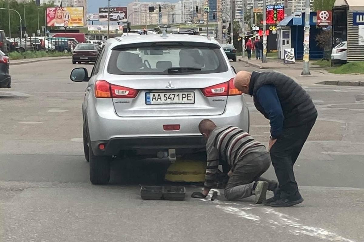 На відео видно авто, яке зупинилося посеред дороги, та двох чоловіків, які намагаються домкратом підняти машину. Під машиною видно жовту антипаркувальну напівсферу.