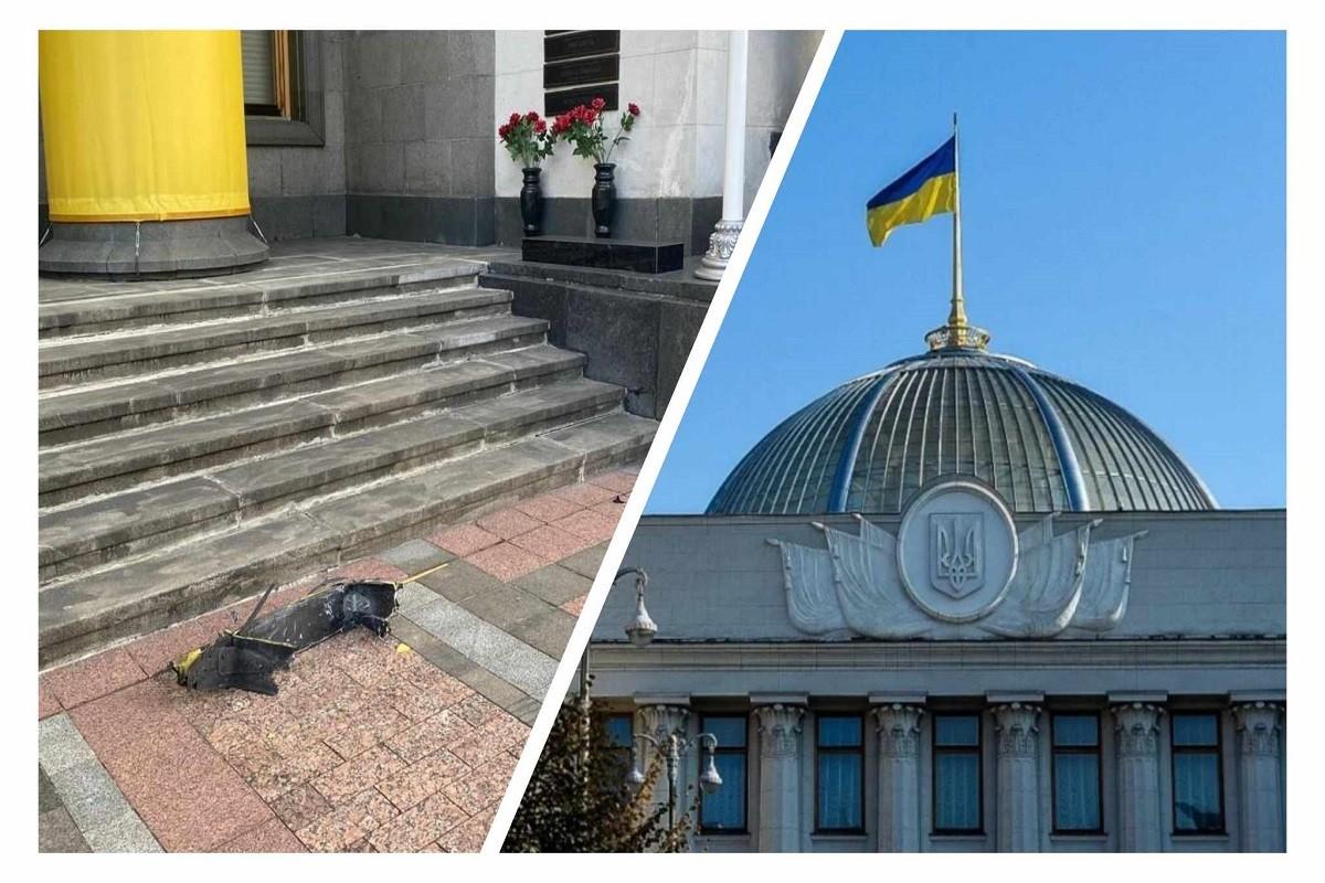 Як можна побачити зі світлин, шматки впали біля сходів перед входом до будівлі парламенту та у внутрішньому дворі. Ворожий обстріл відбувався вночі, та і сьогодні субота, тому в депутати на роботу сюди нині не прийшли.