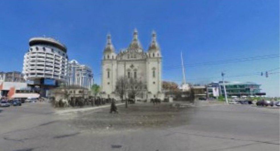 А це фото собору на тлі сучасної архітектури. Кажуть, що готель “Салют” збудували на місці де стояла дзвіниця собора.