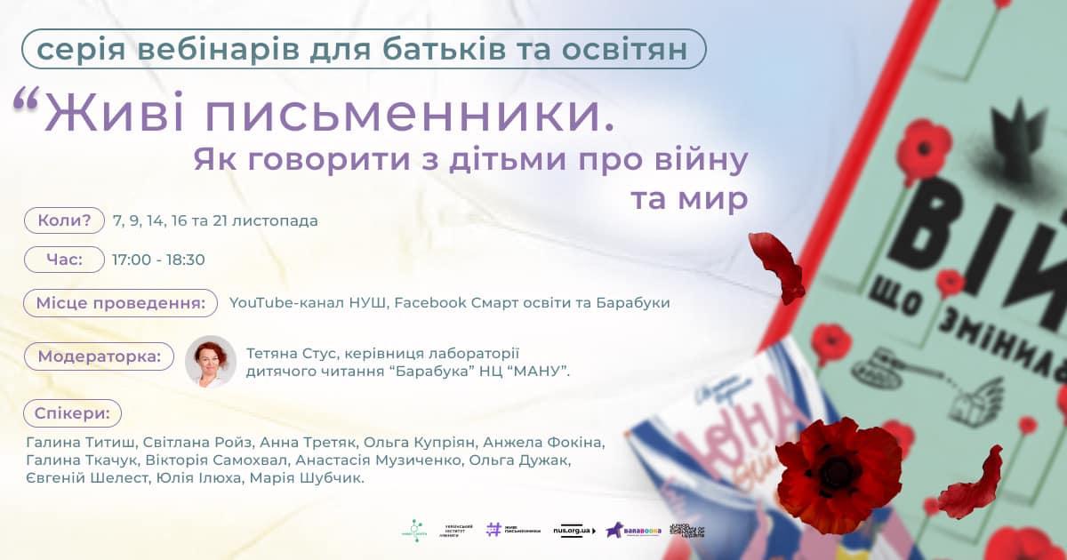 Уже завтра, 7 листопада, стартує цикл вебінарів для батьків та освітян «Живі письменники. Як говорити з дітьми про війну та мир».