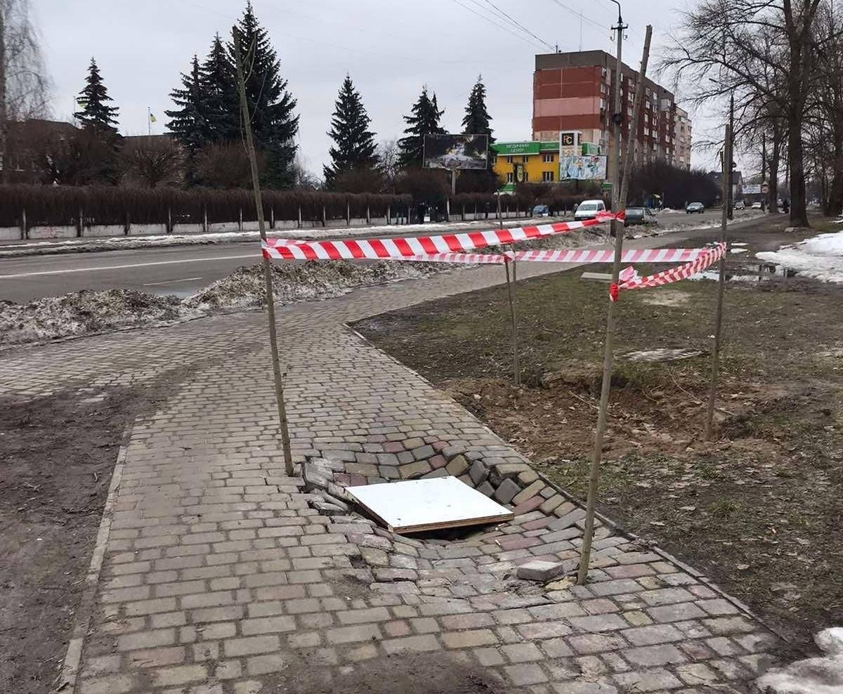 І от, тротуар знову провалився. На тому самому місці. Яма огороджена попереджувальними стрічками та знову потребує ремонту.