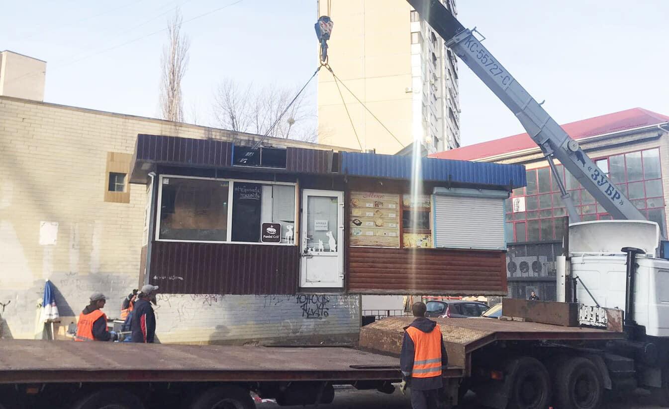 Сотрудники КП «Киевблагоустрий» за неделю демонтировали в городе более 100 незаконных временных конструкций — гаражи, лавки, автокофейни, лотки и др.