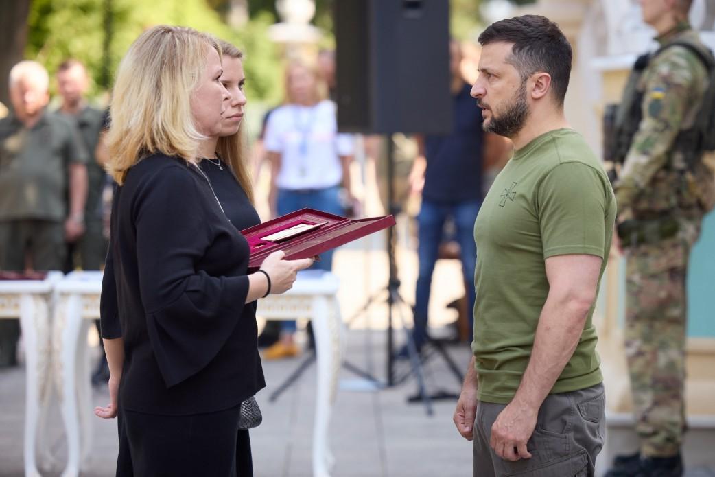 Орден передано й рідним Героя України майора Дмитра Коломійця, який загинув, виконуючи завдання на літаку Л-39. Під час виведення групи з-під ворожого ракетного удару на аеродромі смт Озерне Житомирської області Дмитро Коломієць відвернув на себе вогонь авіації противника. Пропускаючи бойову групу, він був збитий літаком ворога.