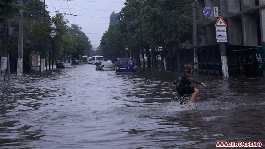 У Житомирі через аномальні опади підтоплено вулиці, дороги й тротуари.