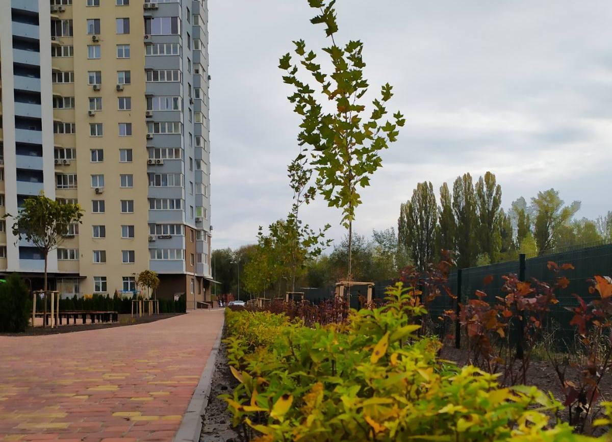 Територія розбита на зони за допомогою зелених огорож: однорядної з 675 кущів дерену, дворядної із 445 кущів спіреї та дворядної з 445 кущів пухироплідника. Також висаджено 20 кущів гортензії, 315 туй, лаванда, декоративні злакові трави, влаштовано більше 2000 кв. м. газону.