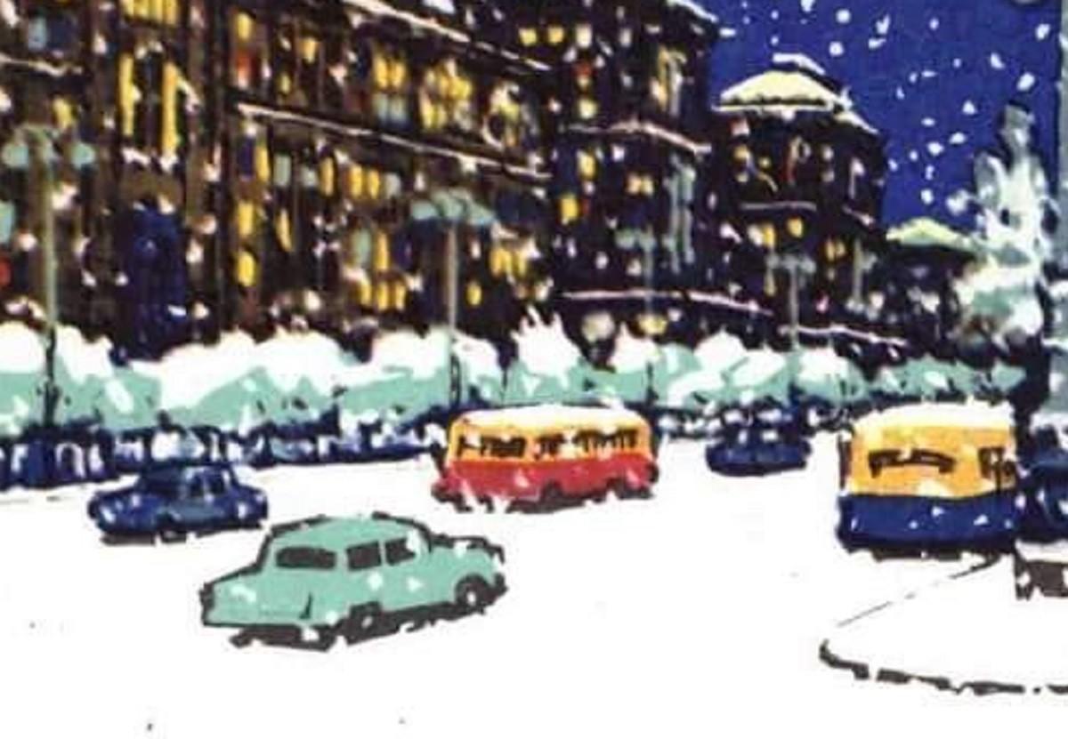 Листівка датована 1969 роком. На ній можна побачити ту скромну кількість автомобілів, яка курсувала у ті роки центром столиці та величезну кількість дерев, вкритих снігом.