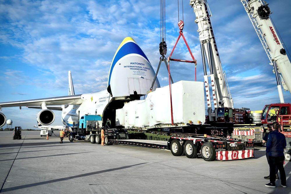 Це високотехнологічне обладнання використовуватиметься у виробництві критично важливих деталей електромобілів на одному з найбільш технологічно розвинених об’єктів у світі. Для його завантаження та розвантаження використовувалися два зовнішні крани, а також спеціальна надміцна та жорстка естокада, розроблена і виготовлена фахівцями ДП «АНТОНОВ» для перевезення важких і великогабаритних вантажів, в тому числі моновантажів вагою до 150 000 кг і висотою до 4,10 м.