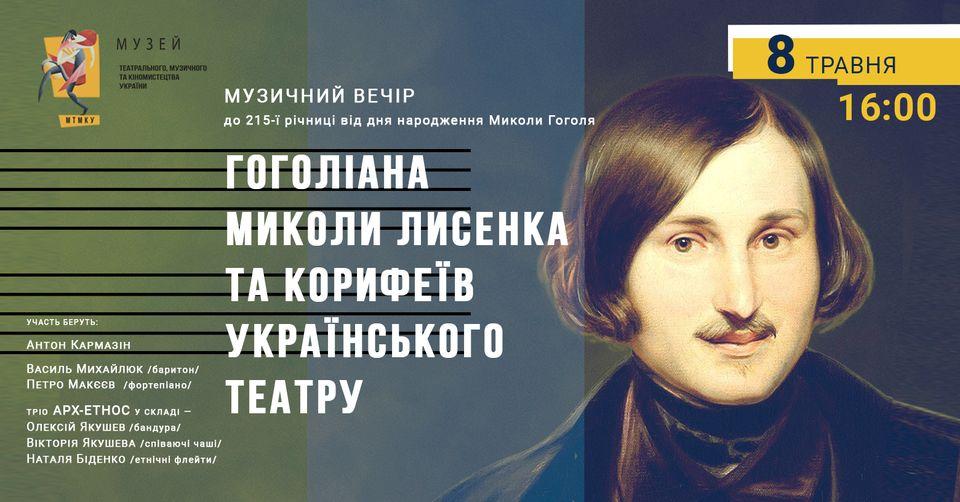 Твори Миколи Гоголя є літературним джерелом опер Лисенка, творчості Старицького (лібрето опер), Кропивницького (оперета «Вій», драматична сцена), Садовського (драматична сцена, український переклад «Ревізора»). Під час музичного вечора прозвучать уривки з творів Лисенка і Кропивницького.
