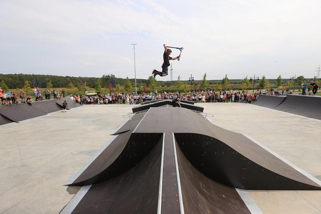 Відразу після відкриття скейт-парк узялася випробовувати майже сотня юних скейтерів і самокатерів.