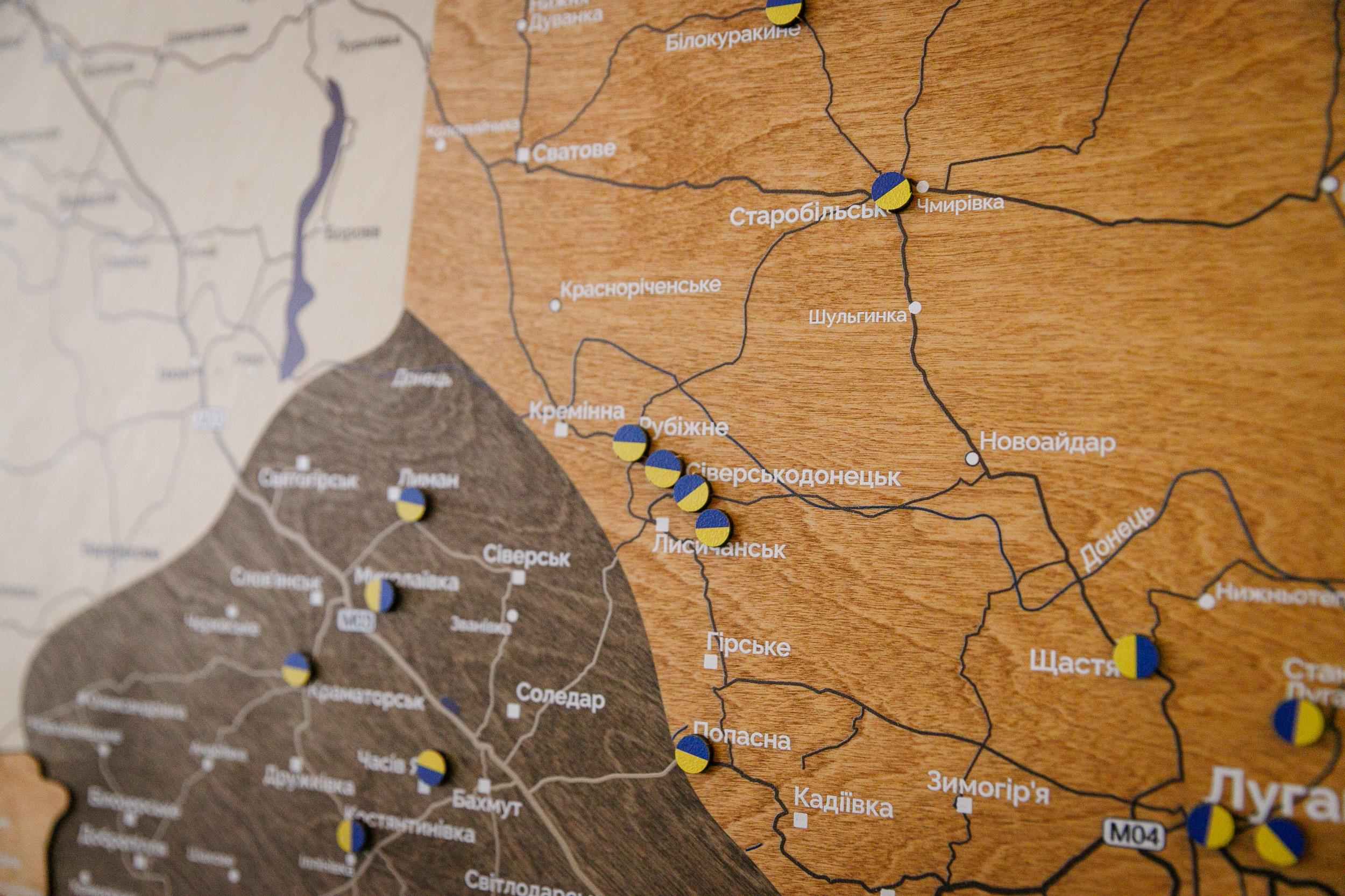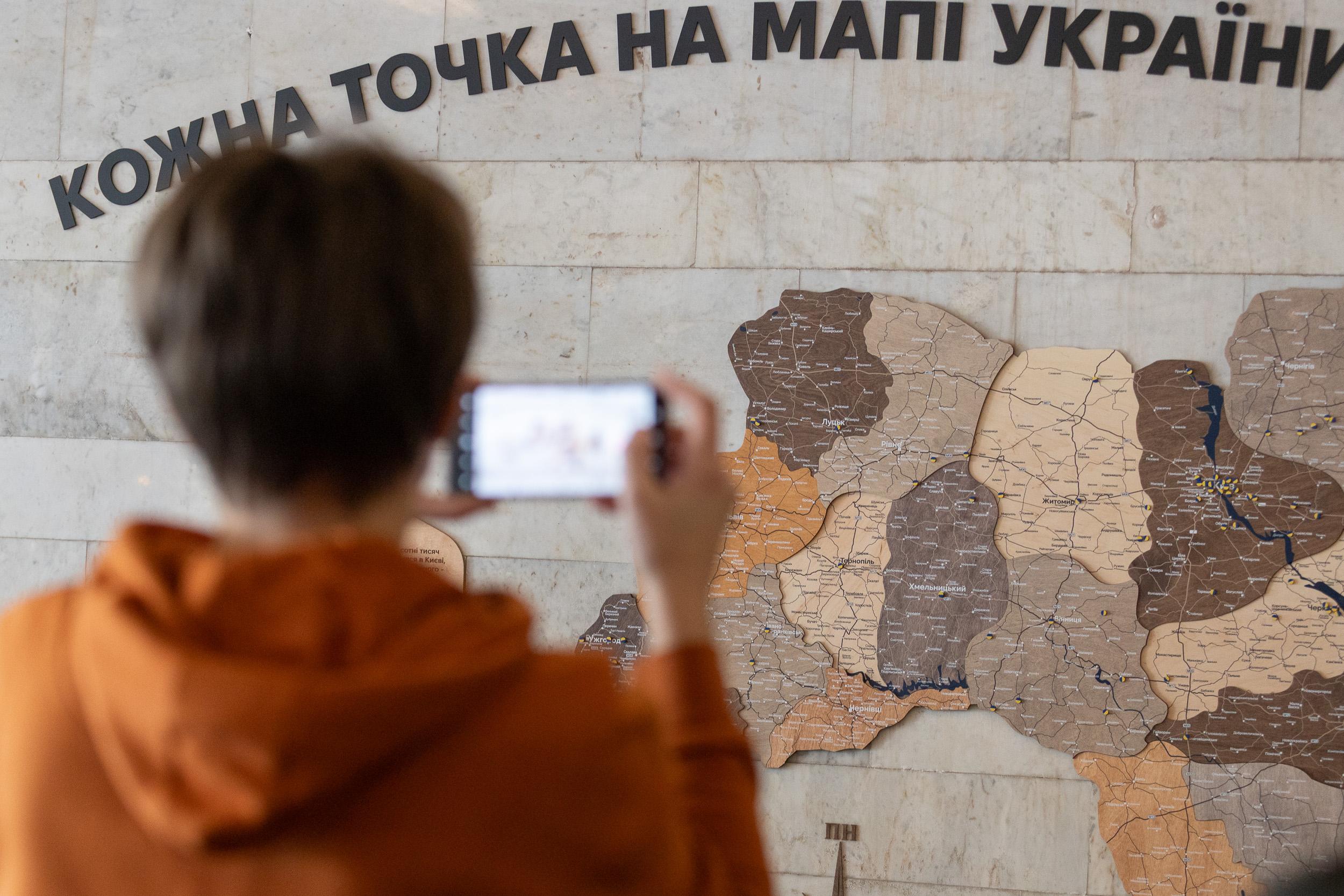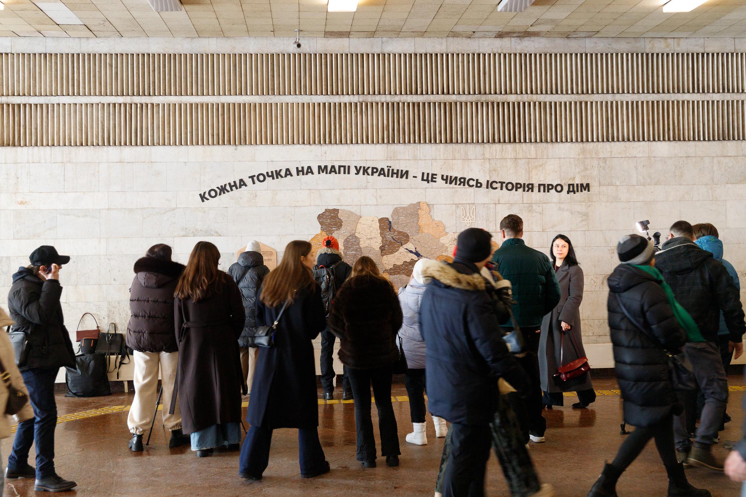 У артвестибюлі станції метро «Золоті Ворота» встановили велику інтерактивну мапу України. Кожен пасажир може позначити на ній місто чи населений пункт, пов’язаний з його особистою історією: місце народження, життя, дитинства чи мрію про повернення після війни. Для цього доступні синьо-жовті наліпки — акція триватиме до 30 березня.