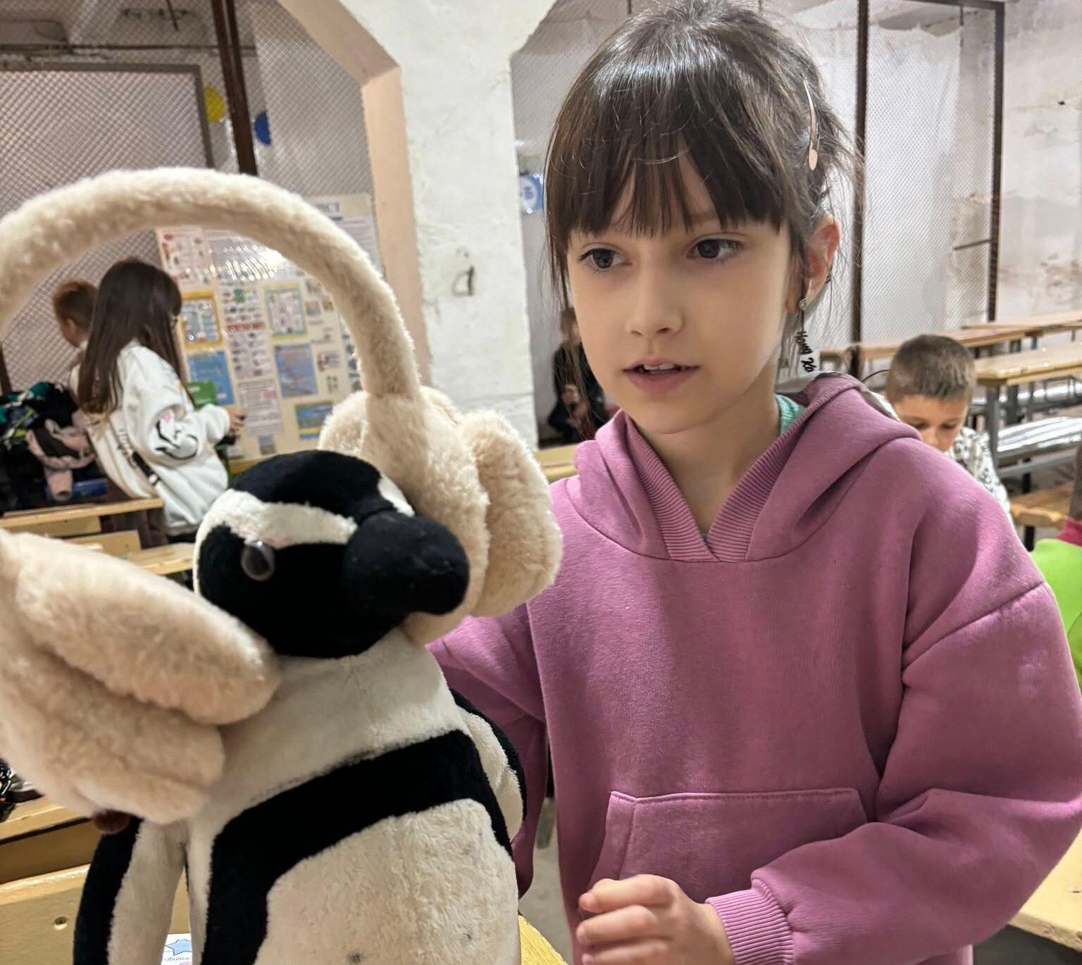 «Він супроводжує учнів на уроках та екскурсіях і завжди вирушає з нами у сховище. Ця іграшка діє як заспокійливе для дітей, коли чути вибухи, чи коли немає поруч батьків», — поділилася Аліна.