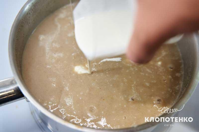 Додайте 150 мл вершків. Перемішайте, поверніть на плиту і варіть ще 2 хвилини після закипання. Додайте сіль і перець, якщо потрібно.