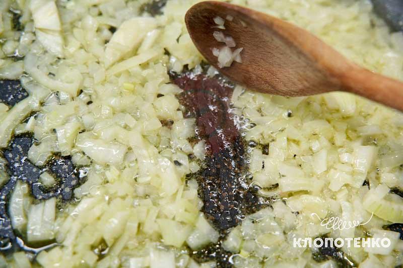 Розігрійте пательню з 2 ст. л. оливкової олії та 20 г вершкового масла. Викладіть цибулю і смажте приблизно 2 хвилини, поки вона не стане м'якою.
