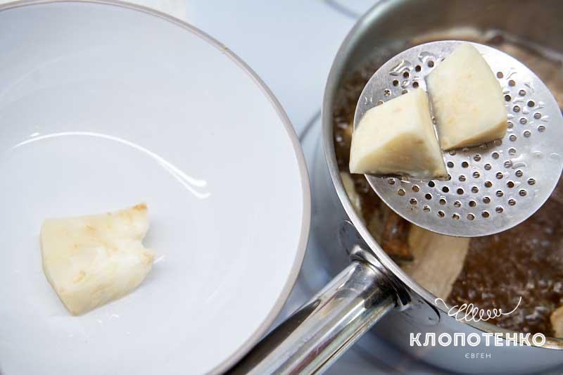 Наріжте 50 г кореня селери великими кубиками. Наберіть в сотейник 1 л води, додайте 10 г сушених білих грибів, селеру, лавровий лист і 3 горошини духмяного перцю, посоліть до смаку. Доведіть до кипіння, потім варіть на невеликому вогні 15 хвилин.