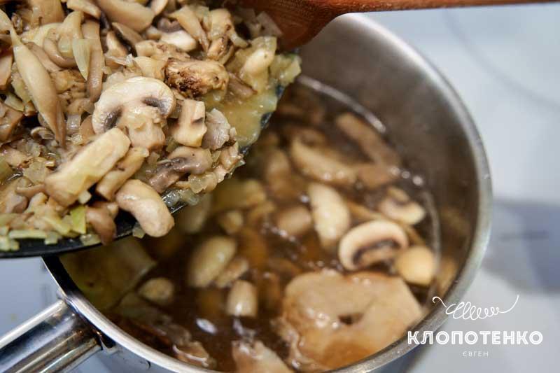 Додайте в сотейник до бульйону смажені гриби з цибулею.