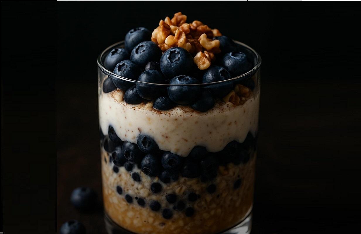 Додайте апельсиновий сік до вівсянки, перемішайте, накрийте плівкою і поставте в холодильник на ніч. Додайте грецький йогурт, мед і лимонний сік. Натріть половину яблука на тертці, додайте до вівсянки та перемішайте. Додайте пів склянки чорниці і знову перемішайте. Прикрасьте рештою чорниці та волоськими горіхами.