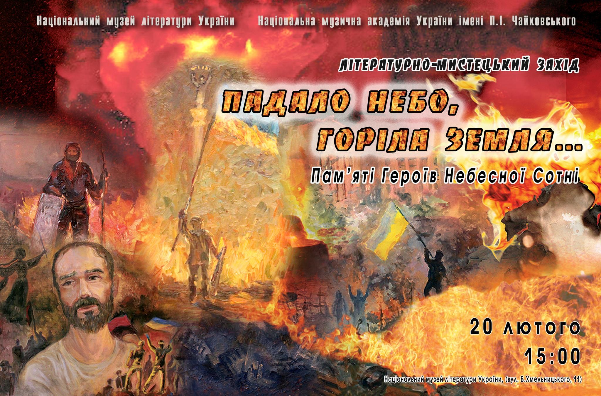 Національний музей літератури України та Національна музична академія України імені П.І. Чайковського запрошують на спільний літературно-мистецький захід і закликають вшанувати всіх тих, хто мужньо боровся на Майдані за утвердження розвитку України як демократичної європейської країни, за права і свободи українців і заплатив найвищу ціну.