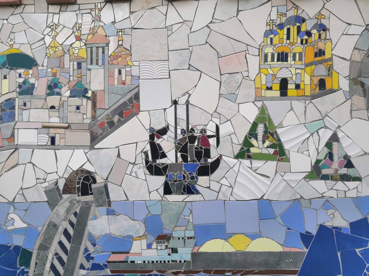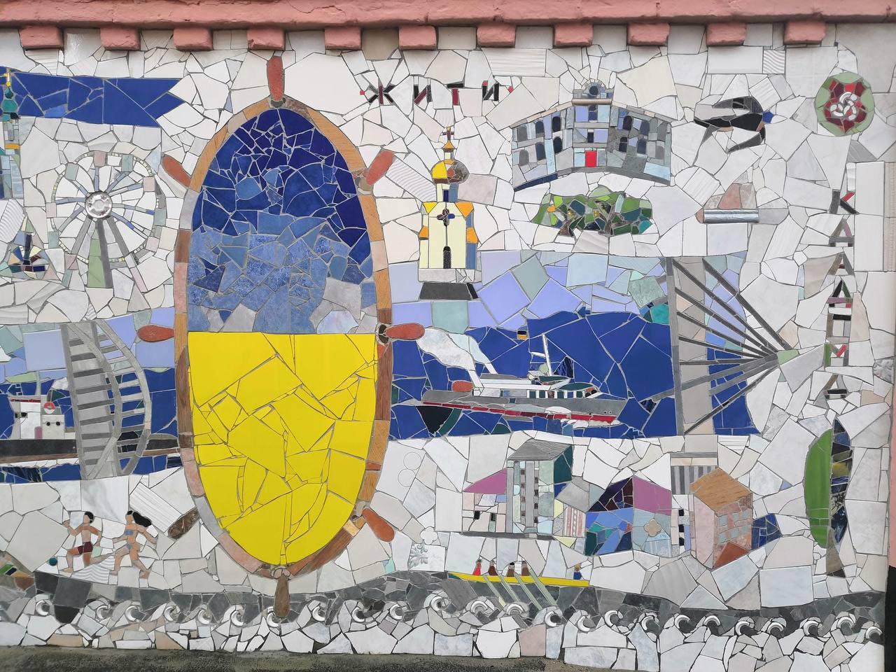 Композицію з битої плитки для Київського вищого професійного училища водного транспорту студенти виклали в супроводі художника Андрія Дудченка. Митець родом з Євпаторії. Він тривалий час займався церковним розписом (про що мріяв з юнацтва), вивчав візантійську іконографію. Його картини демонструють тонке відчуття самотності й відчуження у сучасному світі.