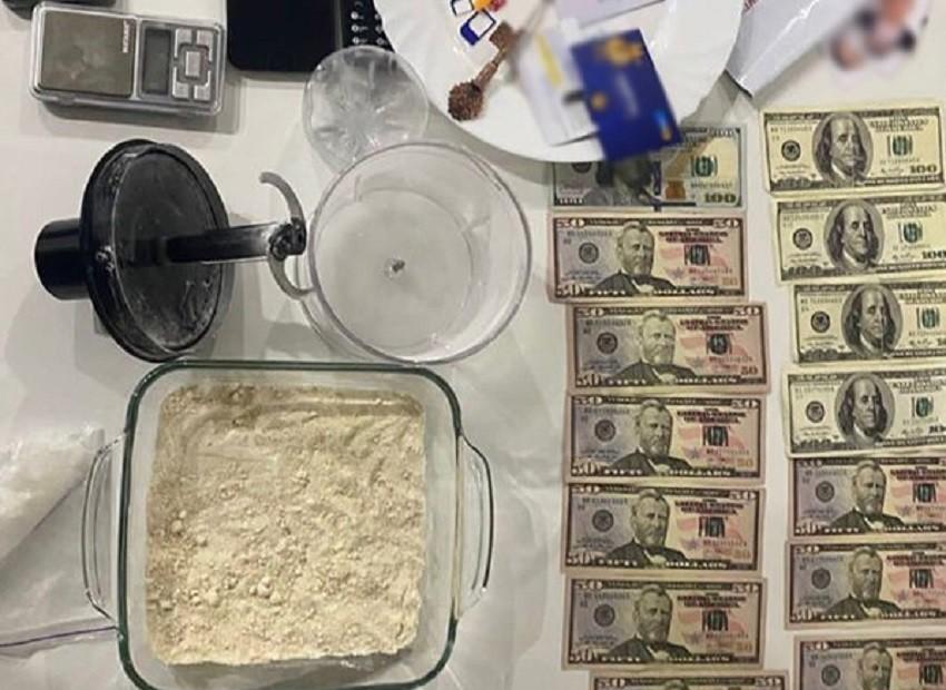 Як повідомили в прокуратурі, було проведено низку обшуків, під час яких в автомобілі, за місцем проживання затриманого та у приміщенні де виготовлявся наркотик вилучено близько 2 кг кокаїну, грошові кошти у сумі близько 3700 доларів, 8000 гривень, предмети схожі на долари з ознаками підробки, прекурсори, обладнання для виготовлення та фасування наркотиків, 2 предмети схожих на вогнепальну зброю, 21 набій, мобільні телефони, сім-картки та банківські картки, документи з ознаками підробки.