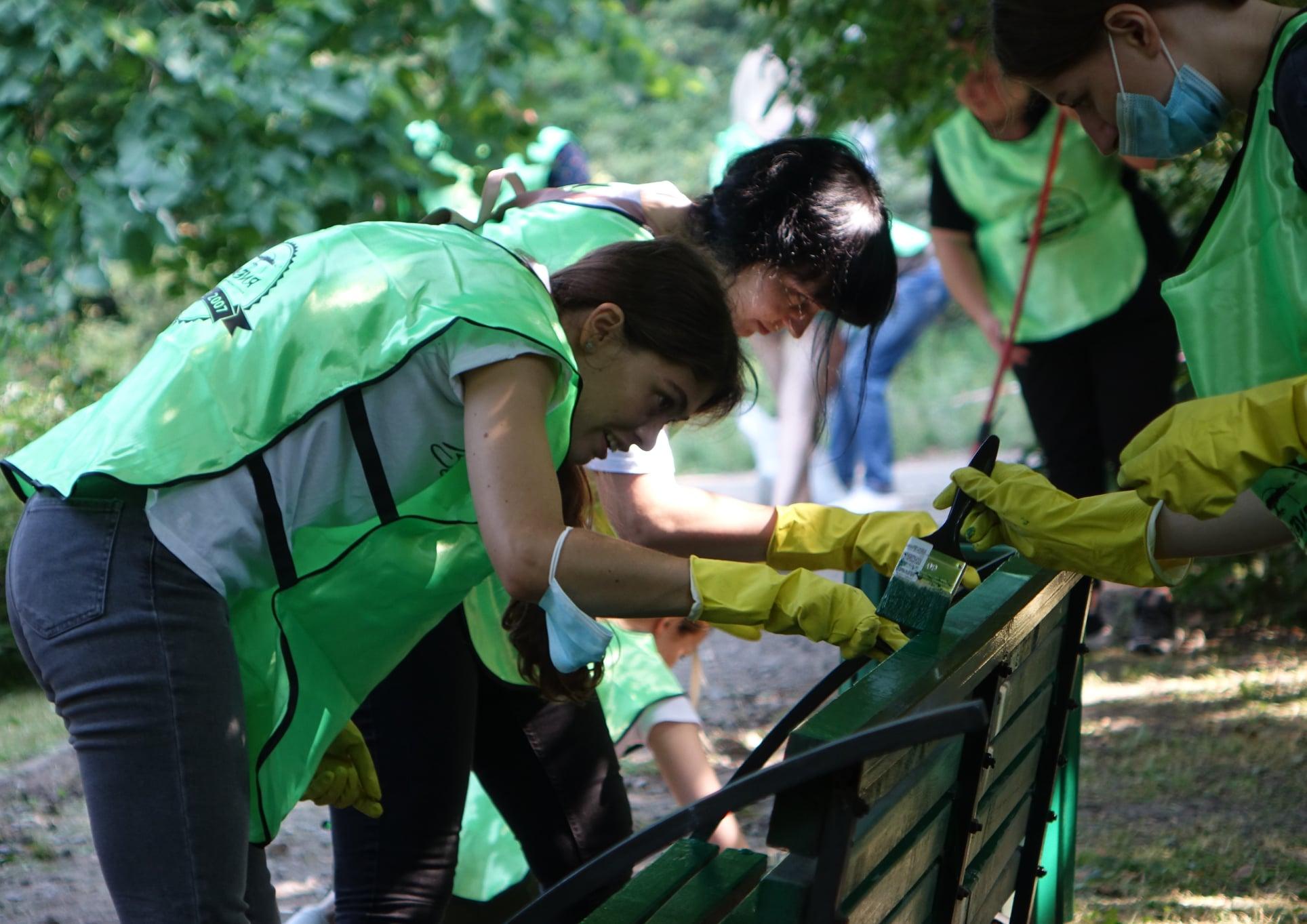 Під час тімбілдінгу хлопці та дівчата прибирали сміття, наводили красу на доріжках, мили скульптури та фарбували лавки.