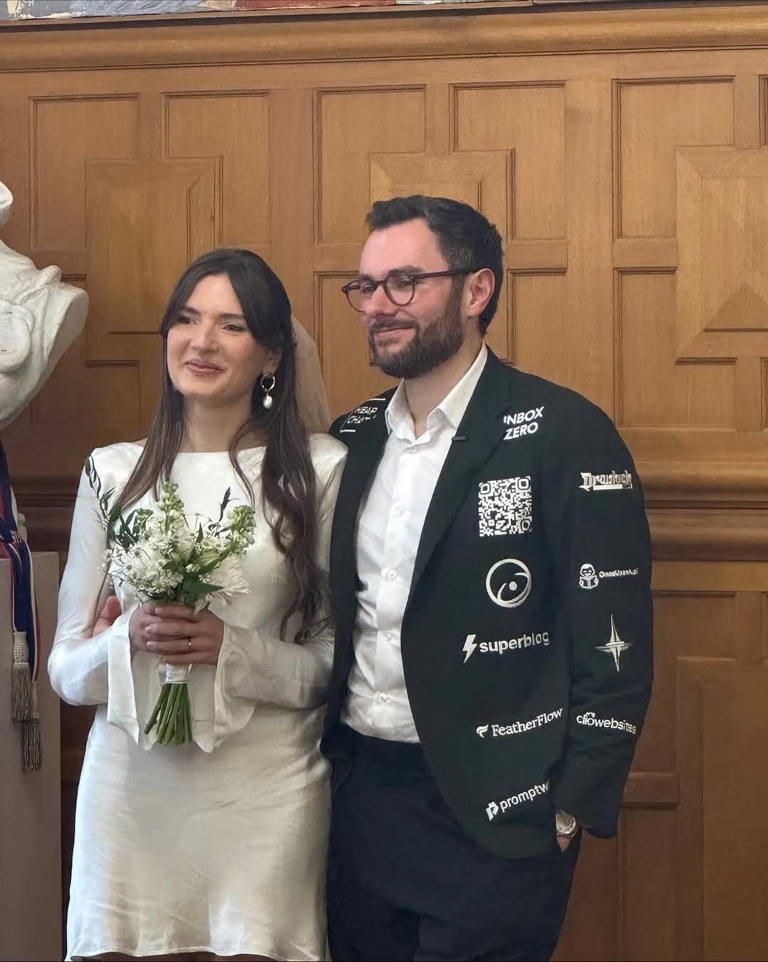 Як можна побачити зі світлин, на піджаку жениха, який фотографували та знімали на відео гості, є як відомі бренди, так і скромні фірми-спонсори з невеликими доходами.