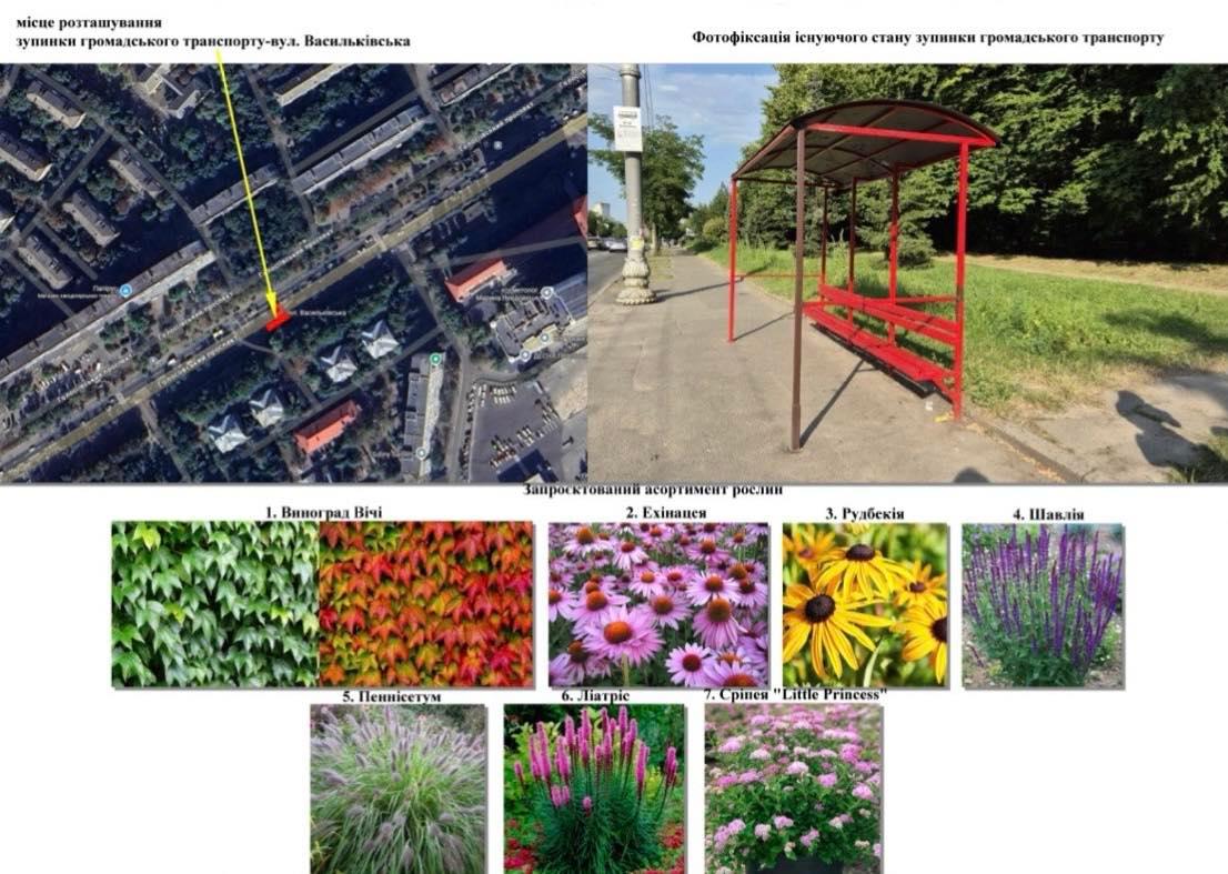 Біля зупинки планують висадити кущі, багаторічні квіти та виноград «Вічі», який з часом сформує зелений навіс над зупинкою.